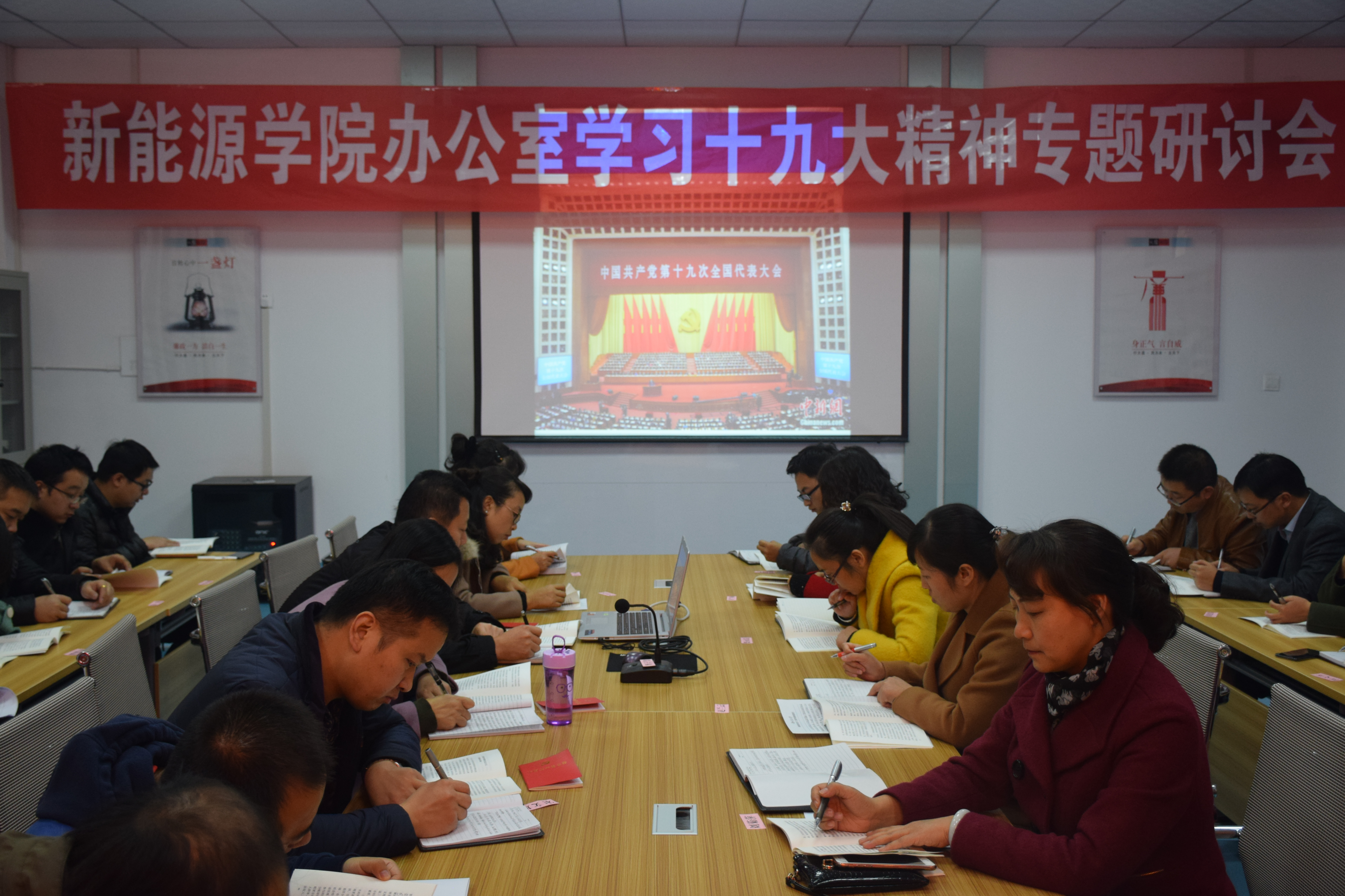 為認(rèn)真學(xué)習(xí)貫徹黨的十九大精神,深入領(lǐng)會(huì)習(xí)近平新時(shí)代中國(guó)特色社會(huì)主義思想,準(zhǔn)確理解和把握新時(shí)代我國(guó)社會(huì)主要矛盾變化以及經(jīng)濟(jì)領(lǐng)域的重大問(wèn)題。11月23日下午,新能源與動(dòng)力工程學(xué)院組織全體教職工在黨員活動(dòng)室召開學(xué)習(xí)十九大精神專題研討會(huì)。會(huì)議由新能源與動(dòng)力工程學(xué)院辦公室黨支部書記任陶主持。