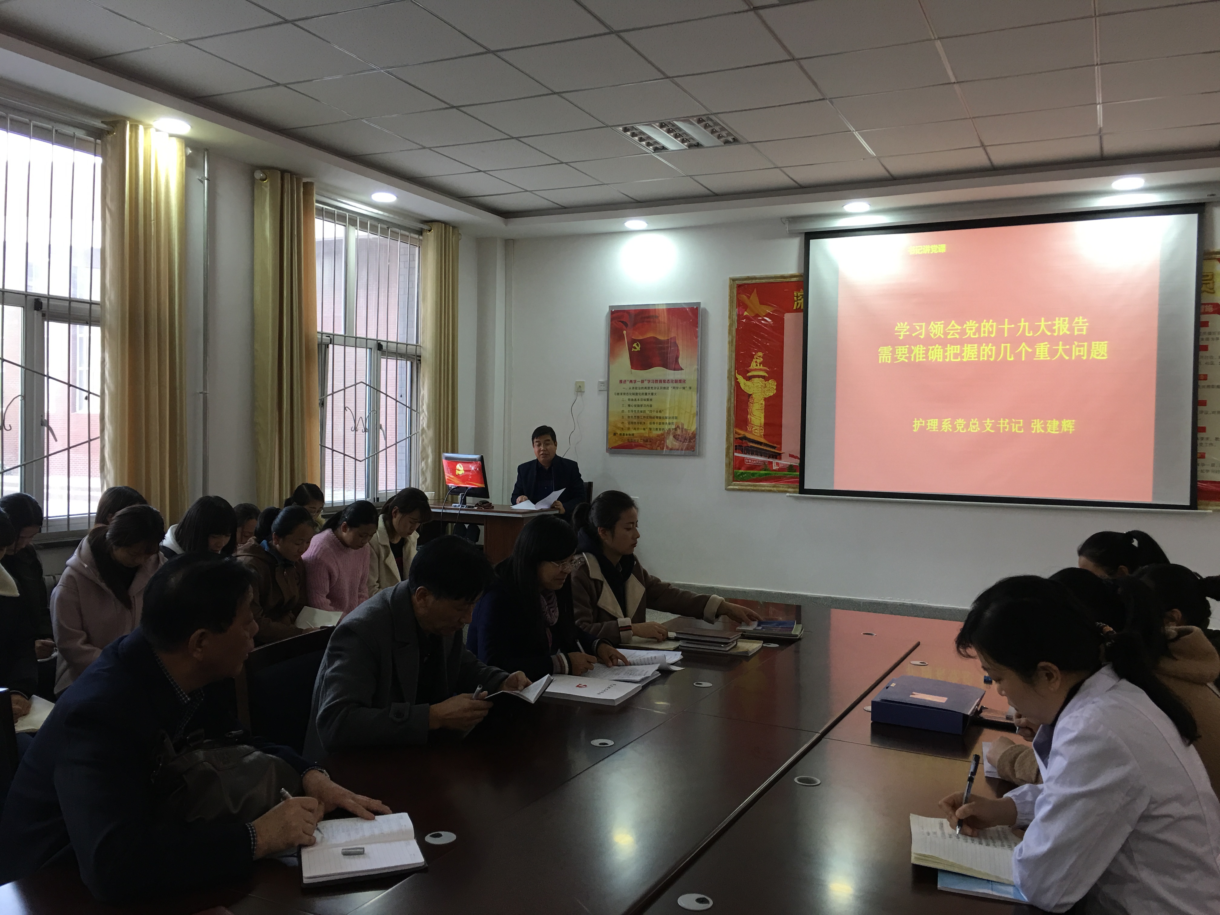 11月17日,護理系黨支部支召開全體黨員大會,黨總支書記張建輝講黨課,就《學(xué)習(xí)領(lǐng)會黨的十九大報告需要準確把握的幾個重大問題》進行專題黨課輔導(dǎo),促進全體黨員對十九大精神的學(xué)習(xí)理解。護理系入黨積極分子聆聽了黨課。